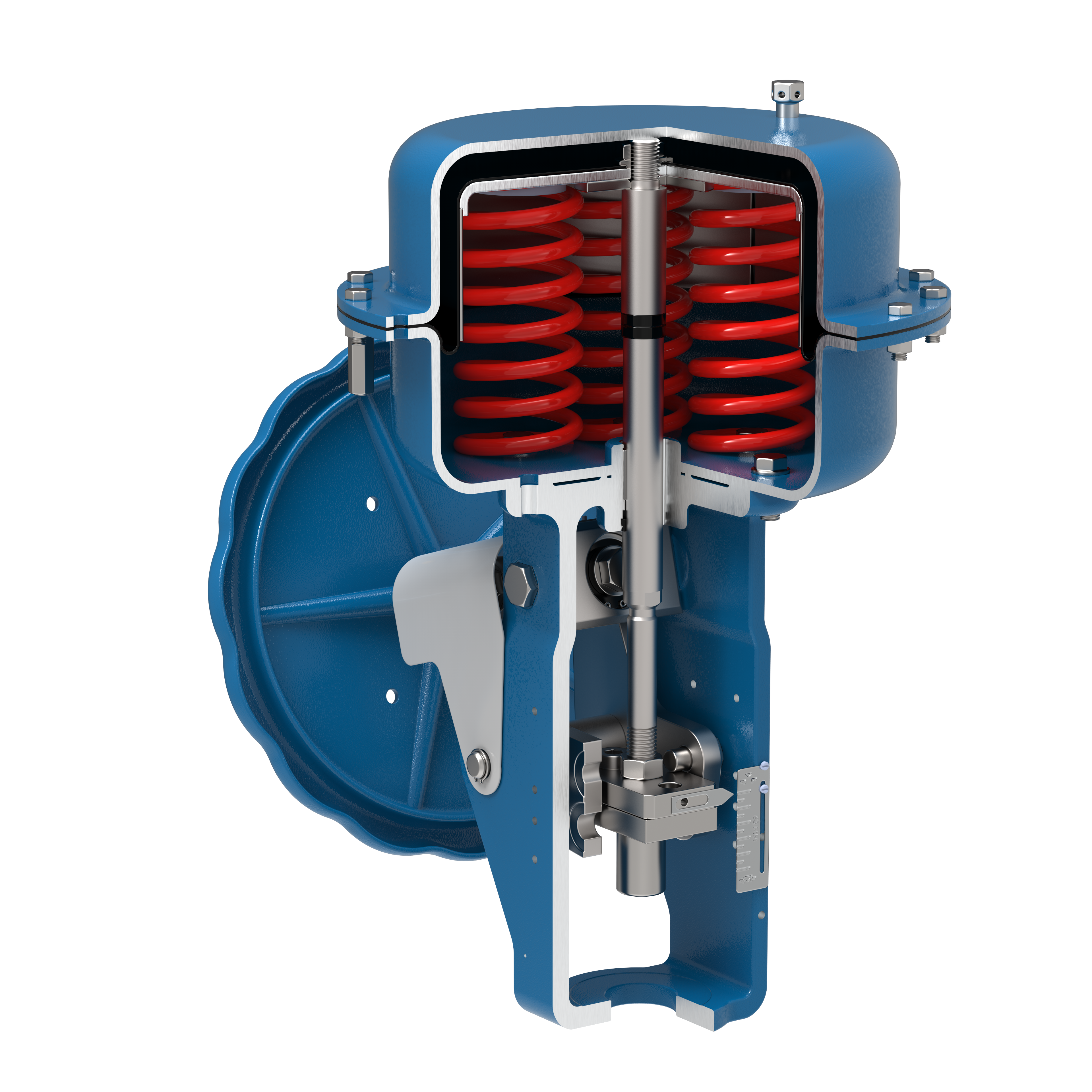 Linearer Membranfederantrieb, pneumatisch betätigt, mit optionaler seitlicher Handradbetätigung.